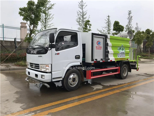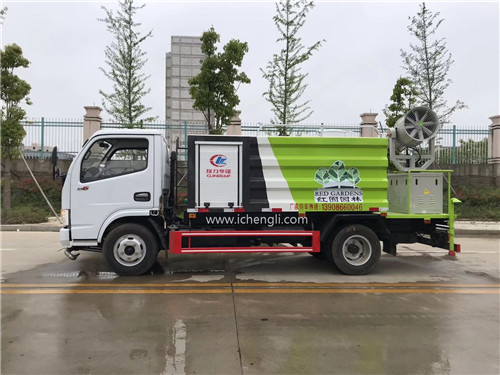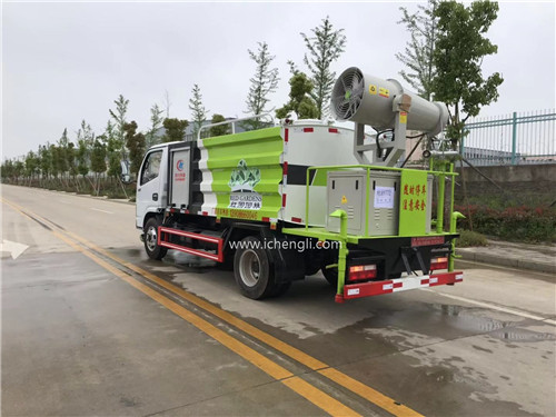 根據客戶要求:方形罐體容積約4.5立方。新款外形方形抑塵車,大氣,漂亮!專用功能為:前沖后灑,帶側噴,帶高位花灑,罐體后帶工作平臺,平臺上安裝綠化灑水高炮,灑水炮可全方位旋轉,并有多種雨狀可調節(大雨、中雨、毛毛雨、霧狀),泵可自吸自排,帶自流閥,帶消防接頭,帶過濾裝置。配30型風送式霧炮機及柴油發電機組內置安裝。