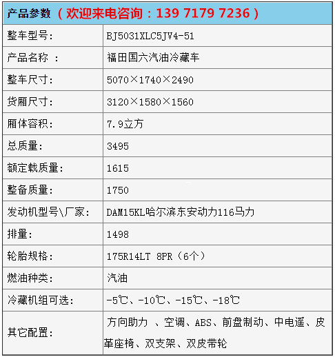 六、選裝配置:可選裝廂體側門(單側門或雙開門),可選裝鋁合金導風槽(導風槽有助于冷氣循環,提升制冷效果),可選裝廂體頂部加固肉勾滑道(直滑道 或 對接互通式拐彎滑道)??蛇x裝廂體內部采用全面不銹鋼材質(海鮮運輸必須加裝,海水有腐蝕性),可選裝280V-380V外接電源(停車熄火后可插電冷機繼續制冷工作),可選裝溫濕度監控記錄儀(帶打印功能)。
