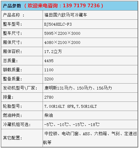 六、選裝配置:可選裝廂體側門(單側門或雙開門),可選裝鋁合金導風槽(導風槽有助于冷氣循環,提升制冷效果),可選裝廂體頂部加固肉勾滑道(直滑道 或 對接互通式拐彎滑道)??蛇x裝廂體內部采用全面不銹鋼材質(海鮮運輸必須加裝,海水有腐蝕性),可選裝280V-380V外接電源(停車熄火后可插電冷機繼續制冷工作),可選裝溫濕度監控記錄儀(帶打印功能)。