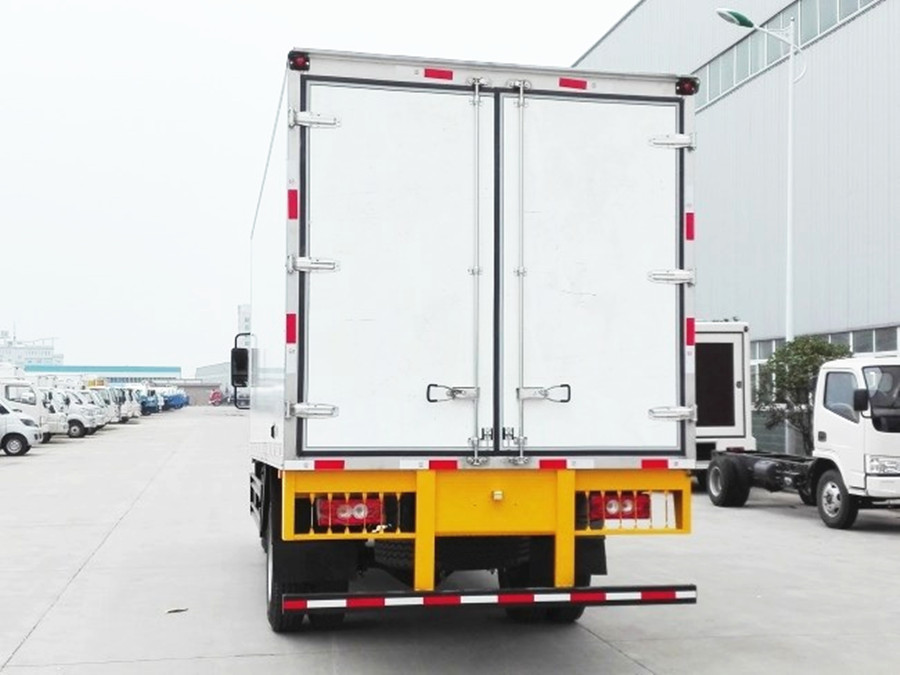 七 廂體配置:我公司冷藏車廂體采用液壓吸附一體成型生產線制造,保溫性能達到國家A級標準。廂體內面料采用最新款納米玻璃鋼(不吸光、隔熱性好、硬度強、抗氧化),保溫材料為8cm高密度聚氨酯保溫層,全密封樹脂膠粘接。廂體框架為防銹處理槽鋼支撐,廂體四周采用鋁合金型材包邊,不銹鋼包角。廂體內部加裝LED夜間照明燈,四角加裝LED式寬度。配后雙開門(不銹鋼包邊、不銹鋼鎖件合頁),(側門選裝)尾部加裝防撞膠塊,采用三元乙丙橡膠密封條,3M反光膠板!