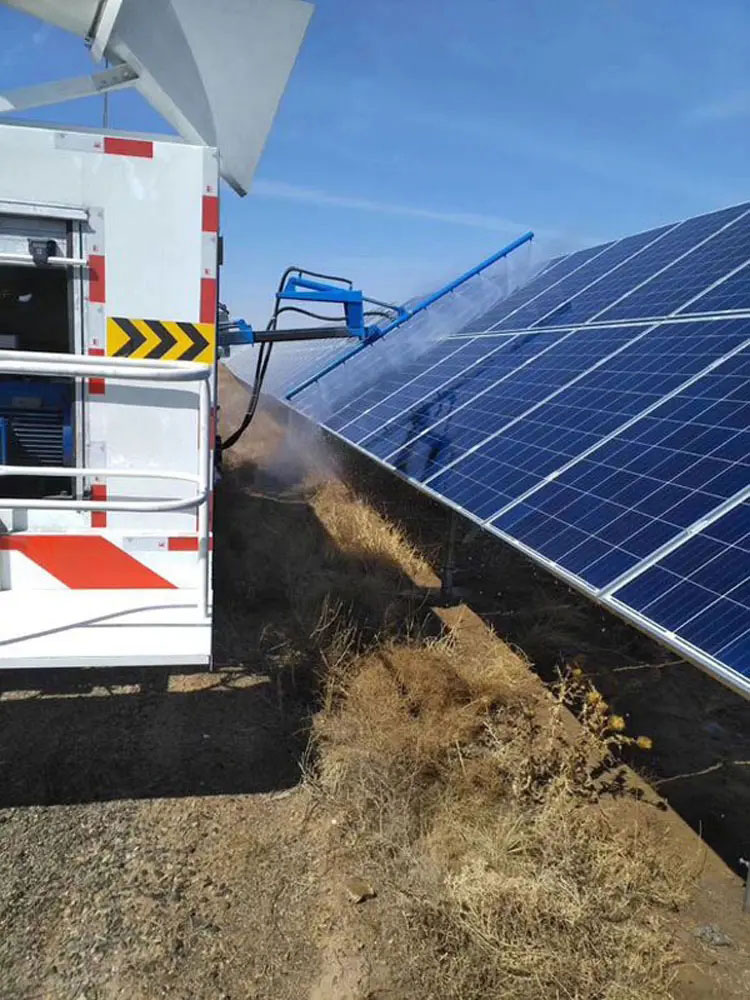 東風多利卡D9_14方太陽能板多功能清洗車高壓清洗車,工廠生產的清洗泵主要是進口的,盡管壓力不是中國制造的高達,進口泵工作更穩定。選擇二類底盤或小型橡膠履帶,浮動承重輪結構,符合各種地形、地貌,使清潔平臺穩定,大限度保持平衡。空壓機,儲存罐以及分刀組成吹風系統,它可以良好的吹走光伏板表面的水珠。清潔支臂可多方面旋轉,可折疊,可靈活調節等功能。考慮到不同的清洗需要不同的水壓,該車配備了高水壓系統和低水壓系統兩種。低壓系統選取雙級葉輪離心泵,大大提高工作效率、射程遠、灑水面積大,還能夠灌溉綠化。