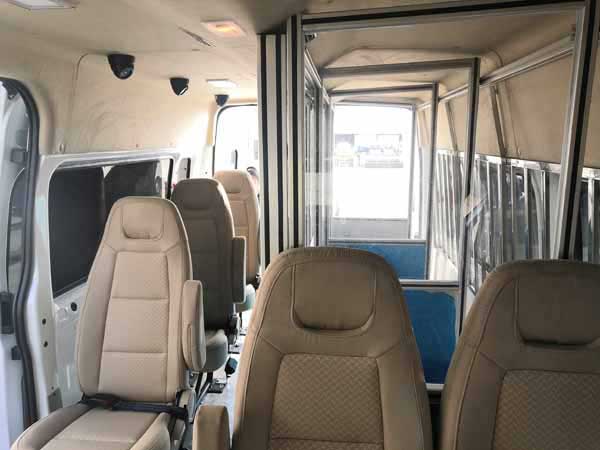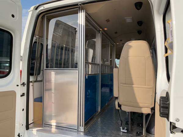 大通V80囚車上裝配置:可實現5G網絡實時定位,使嫌疑人和警員的安全得到充份的保證,安全實用性強。每個囚籠坐椅都有安全防護措施,腳鐐固定環和安全帶,專業性強。囚籠內可加裝全方位監控攝像頭,使嫌疑人與警員的安全得到充分的保障。內部可加裝等離子殺菌凈化系統,防止病毒傳染,安全系數更高。