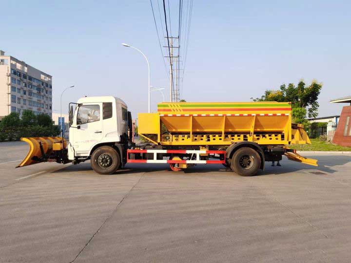 東風天錦12方除雪車,上裝廂體配備高質量的融雪撒布機。除雪鏟3-3.5米。除雪鏟結構合理,可將雪推向一側,并能起到拋雪功能,除雪鏟設防雪棚,具有防止雪飛濺到作業車擋風玻璃上,以免影響駕駛員視線。刷毛為圓盤式單片組合而成,選取聚丙烯與彈性鋼絲混合排列。車體之外配備照明系統,輕易夜間作業。