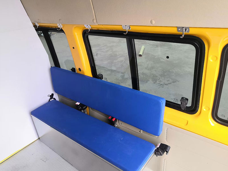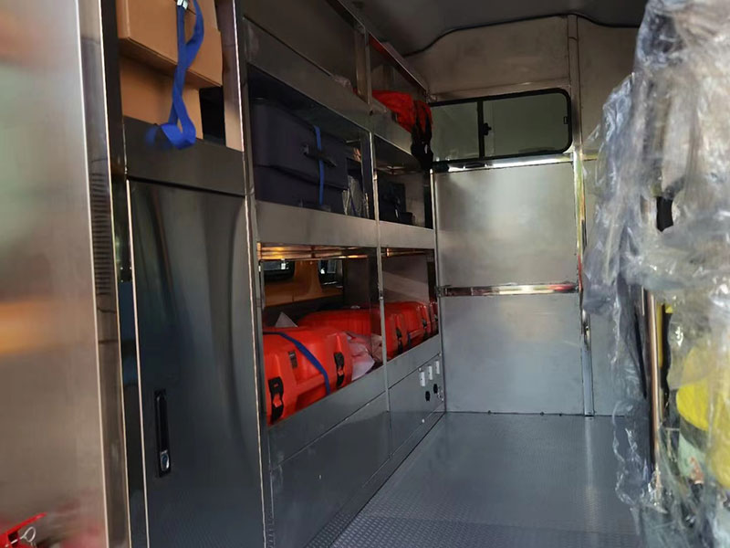 5-9人座工程搶修車_福特V348礦山應急氣防車工程搶修車上裝配置:礦山應急氣防車的總體結構為駕駛室和艙體、車體。前頂安裝警燈凸臺、長排爆閃警燈,左右兩側頂藍色方形LED警燈和白色方形LED警燈,藍白警燈成對排列,尾門頂部安裝藍色爆閃燈能夠有效警示。艙體右側折疊椅的左側設有器材骨架Ⅱ,器材骨架Ⅱ后側配備滅火器。座椅包裹性強,用料也挺扎實的,坐起來很舒服。長排燈、外場照明燈、設備天線、爆閃燈安裝在車的頂部。外層鋪蓋一層阻燃金屬布,防火性更好,不便于氧化,內飾應用1.2mm厚網孔板。有助于提高發動機的冷卻條件和汽車行駛穩定性,車輛內部具有極佳的通風。