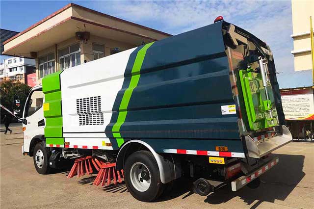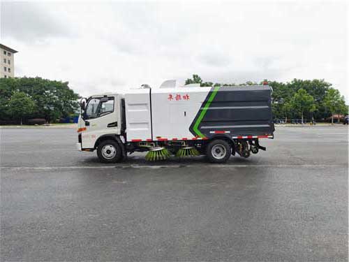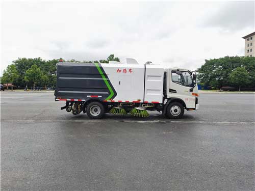 5.5方掃路車_江淮駿鈴V3掃路車,清水箱容積1.5立方,垃圾箱容積4立方,可持續工作4小時以上。垃圾箱選取雙層不銹鋼結構,結構穩定,耐一般腐蝕。長期選用不易變形。上裝箱體分為三大部分,垃圾箱,清水箱,副發動機艙。吸塵盤的四周設有高度可調節的吸嘴輪,這樣的吸嘴輪有三個。廂體方型結構,受力均勻。輔機艙內,設有輔機、油箱、離心風機、液壓閥組等部件,半封閉結構,維修容易。