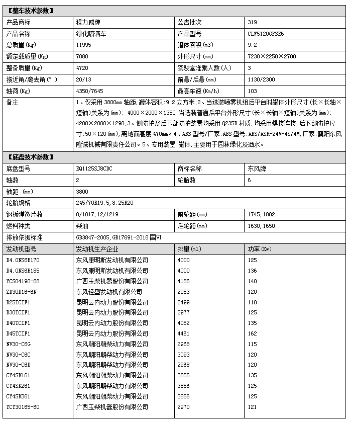 專用配置:罐體容積 9.2立方,罐體采用國標Q235碳鋼材質(zhì),罐體厚度4MM,前后封頭5MM加厚型,罐體內(nèi)雙層隔板具有防波蕩作用,以減輕汽車行駛時罐內(nèi)液體沖擊;灑水車整車及外形尺寸嚴格按國家機動車公告制作而成;裝配大功率專用灑水泵,整車前沖、后灑、側(cè)噴、后平臺帶綠化灑水炮,灑水炮可全方位旋轉(zhuǎn),可連續(xù)調(diào)成直沖狀、大雨、小雨、毛毛雨;配消防接口,自流閥,濾網(wǎng),帶自吸自排功能。前封頭帶水位計,后平臺主管路帶1寸澆花接口,后爬梯,帶1個消防接頭,帶1個自流閥,1個過濾裝置,其余標配。1、可選裝后平臺帶霧炮機組用于噴霧降塵、農(nóng)藥噴灑作業(yè);2、可選裝前置電子灑水炮駕駛室操作;3、可選裝氣動球閥駕駛室操作。