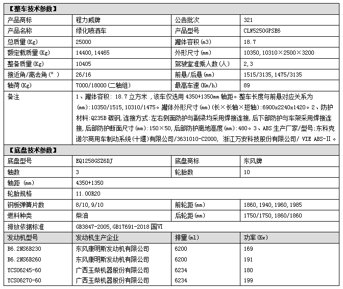 底盤配置:采用東風后雙橋原裝專用底盤,新款D913駕駛室,4350+1350mm軸距,搭載國六(國Ⅵ)康明斯230/260馬力柴油發動機,8檔變速箱,10T后雙橋,11.00R20鋼絲胎,方向助力、斷氣剎、電動窗、中控鎖、多功能方向盤,ABS,空調,GB7258新規。