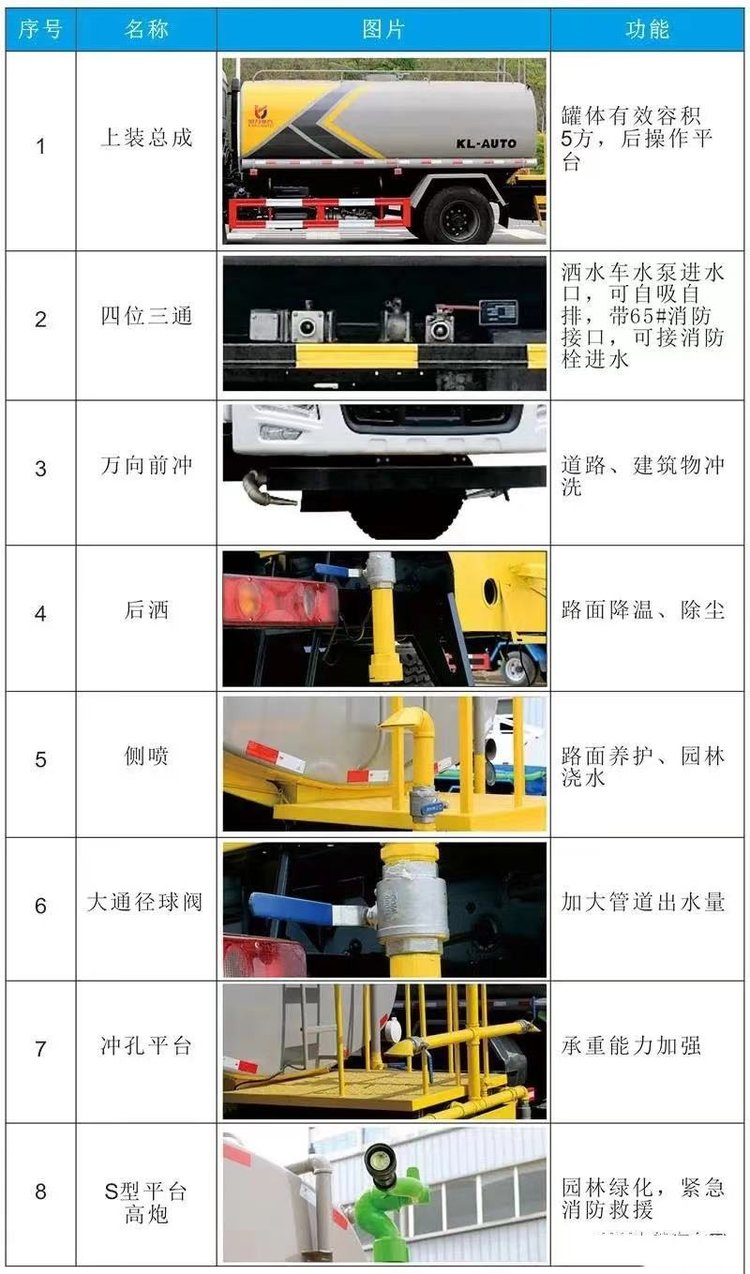 適用于園林綠化、公路灑水、消防滅火,礦山降塵,生活小區滅火,電廠消防,在缺水地區也可作供水、輸水用車,適合撲救一般性火災,是公安消防隊、企事業專職消防隊、學校、森林消防部門、機場、工廠、礦區常備的消防車輛, 需要時還可作噴藥車使用。