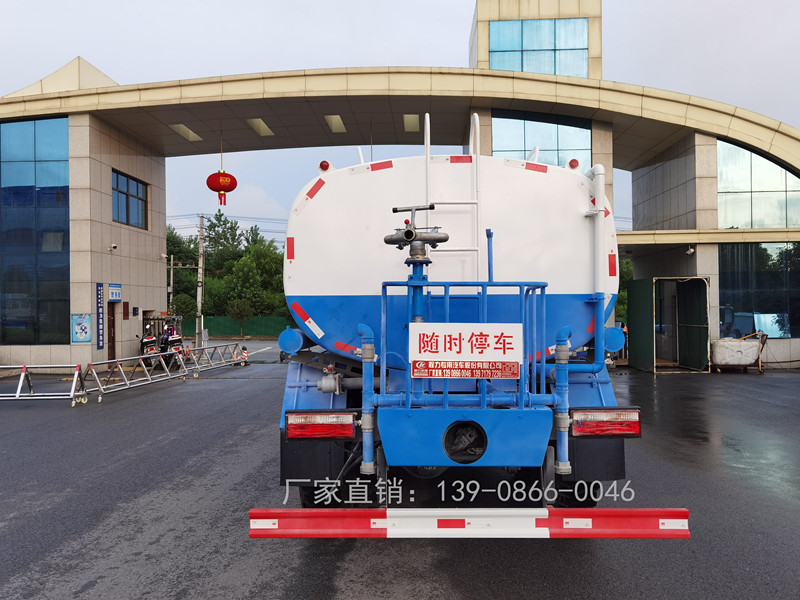 罐體容積:12立方,罐體鋼板采用4mm碳鋼Q235材質一次成型,大口徑直通球閥,鋁合金三通,整車螺栓鉚接,無焊接;罐內隔板具有防波作用,以減輕汽車行駛時罐體液體沖擊,配大功率專用灑水泵,泵可自吸自排,整車前沖、后灑、側噴、帶65消防接口,帶自流閥,帶過濾裝置;后平臺帶綠化灑水炮,灑水炮可全方位旋轉,可連續調成直沖狀、大雨、小雨、毛毛雨;前封頭帶水位計,后平臺主管路帶1寸澆花接口;尾部帶安全告知牌:“隨時停車,注意安全”,帶兩根抽水管及陰陽端;罐體兩側噴“灑水車”字樣或需方字樣,罐體顏色:白藍;貼反光標識;罐體防腐處理;灑水車出廠之前整車打蠟,以防止海水侵蝕;其他標配。