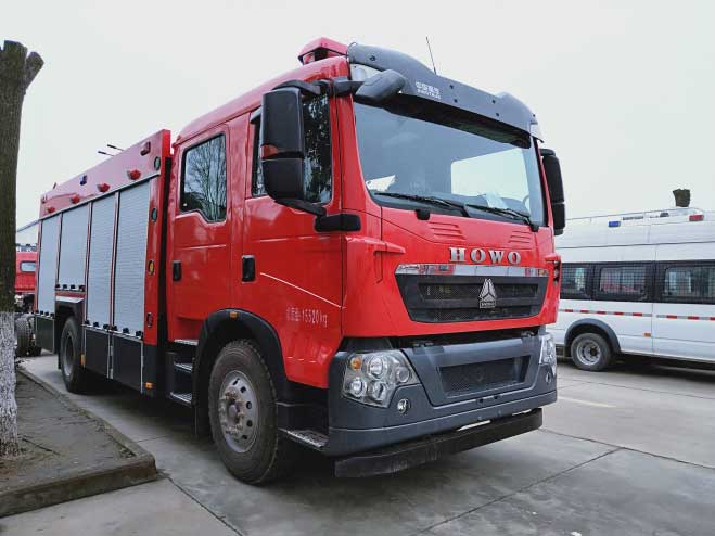 豪沃T5G8噸水罐消防車,為了更精準對準著火點滅火,箱體配備有爬梯,消防員能夠借助爬梯登上箱體操作消防水炮。具有動力強勁、環保節能、扎實耐用、機動性強、射程遠等突出優勢和特點。消防管路全部應用大口徑鋁合金材質,管路壓力損失小。器材支架采取歐洲技術生產的鋁合金型材,內藏式塔接制造,全內六角連接結構,精美耐用。罐體采用優質碳鋼材料,內框架焊接,設置縱、橫防蕩板,溶液分區存放。