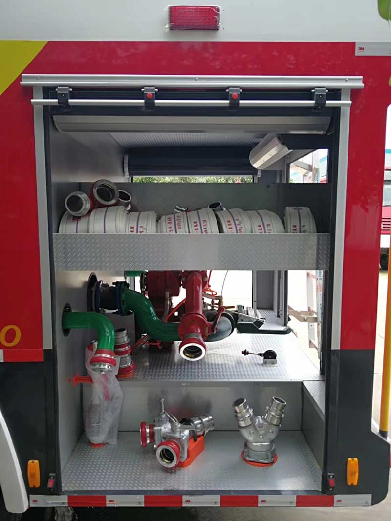 5方水罐消防車_江蘇常州東風多利卡D7雙排水罐消防車上裝參數:PS30W型號消防炮,消防炮射程極大于55米。器材箱采取內藏式搭接技術制造,全卯接結構。整車后頂部安裝50W LED消防探照燈1個,360度遙控轉動。下方安裝安全標志燈和側回復反射器 (組合式)。優質方管焊接的主框架結構,碳鋼板焊接的外裝飾板,結構穩固靠得住。車頂安裝防滑材料,可在上面行走。