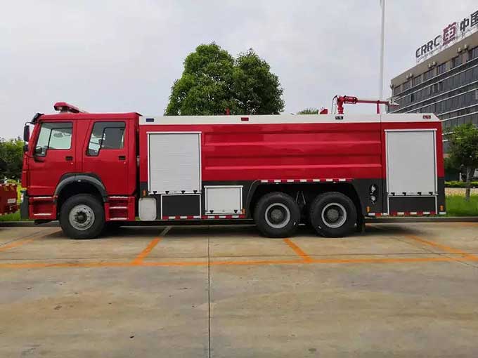 16噸泡沫消防車_重汽豪沃后雙橋泡沫消防車,器材箱內設置有儲物盒,可以放置一些小型工具。載液罐體應用的優質碳鋼材料,罐體內部應用特殊底漆噴刷,防止生銹、腐蝕。設有工具箱及卷簾門,可放置小型工具。主框架結構選取優質方管焊接,外裝飾板選取碳鋼板焊接。車內器材應用專用夾具固定,器材是由防腐蝕、防震動和防脫落的專用材料制成。