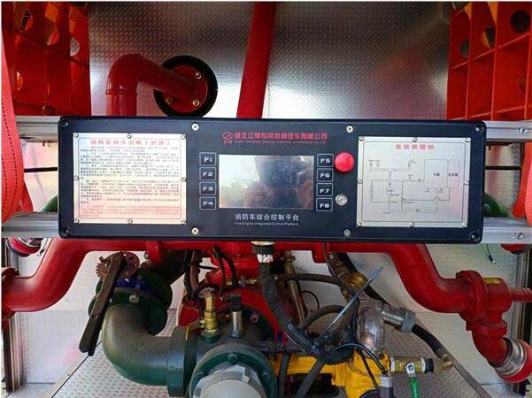 凱普特K7_5方水罐消防車上裝配置:下方安裝安全標志燈和側回復反射器 (組合式)。水泵上面有一系列的操作面板、操作按鈕以及操作說明,輕松工作人員的各項操作。配備多個警示燈裝置 ,駕駛室前部的長排警燈、箱體尾部的圓警燈、左右兩側的爆閃燈等。箱內設置有多個儲物盒以及器材固定裝置,布局合理,位置固定,收納整齊,簡單拿取。儀表板上裝有:壓力表、液位計、電源總開關及器材箱燈開關等。位于全車后部泵房內的消防泵是低壓離心式的。車輛兩側上方各配有2個紅藍爆閃燈及2個側照明燈。