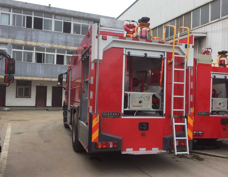 豪沃T5G8噸水罐消防車上裝配置:在結構方面,器材廂布置合理、器材取用更加方便,特制夾具固定裝置使器材存放更加牢固。上裝廂體選取高強度鋁合金型材制成,內外蒙皮均選取波紋鋁板整體制造。器材廂卷簾門選用優質鋁合金設計制作,啟閉靈活、噪音低、密封性好、造型漂亮。