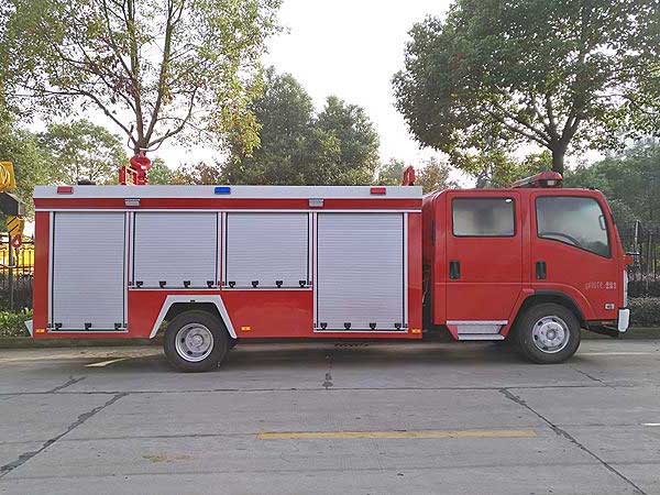 3噸泡沫消防車_慶鈴五十鈴700P泡沫消防車,翻板式踏板選擇氣彈簧、門止限位裝置雙重固定,安全性能靠得住。泵房位于車輛后部,兩邊與后邊設鋁合金卷簾門,內有照明燈,泵室兩側可放置部分常用器材。除原車設備外,駕駛室內加裝有取力器控制指示燈、100W警報器、LED警燈、標志燈、示廓燈開關及后部照明燈等。器材廂門采用鋁合金簾子門,滾筒、滑槽導向,啟閉輕便、噪音小。裝水2000L,泡沫1000L。