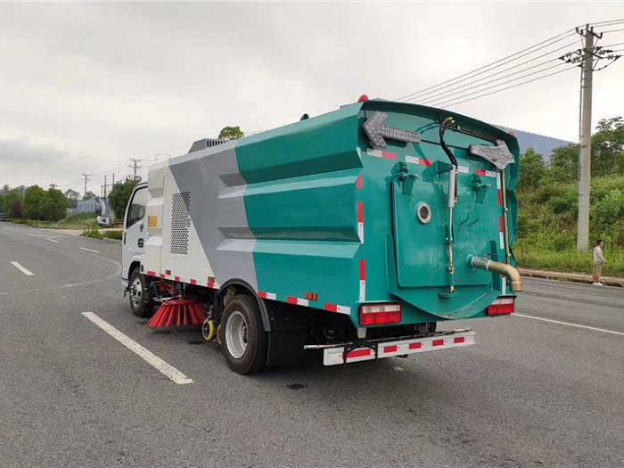 多利卡D6_6方洗掃車,掃刷選用彈簧懸浮避障功能。中置兩掃盤。箱體頂部設置了導流槽,提高降塵效果,使垃圾堆積均勻,提高有效容量。江鈴87馬力副發動機。清掃速度:3-20km/h。垃圾箱底部裝有水箱。