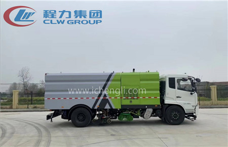 1、洗掃車采用東風天錦DFH1180EX8型國六二類汽車底盤改裝,加裝副發(fā)動機、風機、高壓水泵、清水箱、垃圾箱、左右立掃、帶噴水桿的寬吸嘴、低壓沖洗系統(tǒng)、掃盤降塵系統(tǒng)、液壓系統(tǒng)、專用裝置電控系統(tǒng)和副車架等改裝而成。 2、 副發(fā)動機驅動風機和高壓水泵,副發(fā)動采用東風康明斯六缸170馬力柴油發(fā)動機。風機用8.0高壓離心風機,效率高、風量大,最高風量達23500m3/h。高壓水泵采用國際知名CPX036型柱塞泵,流量合適,壓力高,允許最高壓力達10MPa。 3、清水箱充分利用了車載空間,容積大,容積達9m3。垃圾箱采用單層304不銹鋼結構,傾翻卸料,帶高壓自潔裝置。自潔裝置可在垃圾箱卸料時幫助卸料,清洗垃圾箱內部。 4、左右立掃為單掃盤,減少了掃刷數量和掃刷消耗量,能降低使用成本。左右立掃分開控制,可實現左掃、右掃和全掃等不同作業(yè)模式。寬吸嘴的吸口寬度達到2418mm,確保作業(yè)總寬度大于3.5mm。4個高度可調的吸嘴輪,能多方面調整和保證吸嘴與路面間的合理間隙。吸嘴內置高壓噴水桿,盡可能多的將高壓洗滌噴嘴布置在吸嘴內部,不但清洗效果好,還能最大限度減少高壓水氣流沖起污物產生的二次污染。 5、 左右噴水桿安裝在吸盤上,隨吸盤升降,結構簡單緊湊,保證噴水桿的離地高度固定不變,達到最佳清洗效果。開放式液壓系統(tǒng)驅動左右立掃升降、左右掃盤旋轉、吸嘴升降、垃圾箱后門開閉、垃圾箱傾翻復位等機械動作。 6、 底盤變速箱側取力器驅動低壓水泵,實現灑水車的低壓沖洗功能,一鍵式作業(yè)起動和停機操作。