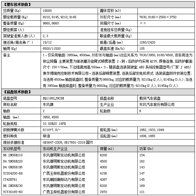配置一:東風D9多利卡系列駕駛室,4500mm軸距,玉柴200馬力(YCS04200-68)發動機,法士特8檔變速箱,10.00R20鋼絲胎,空調電動窗,ABS,斷氣剎,方向助力;